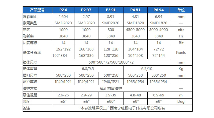 | 產品型號 | P2.6 | P2.97 | P3.91 | P4.81 | P6.94 | 單位 |